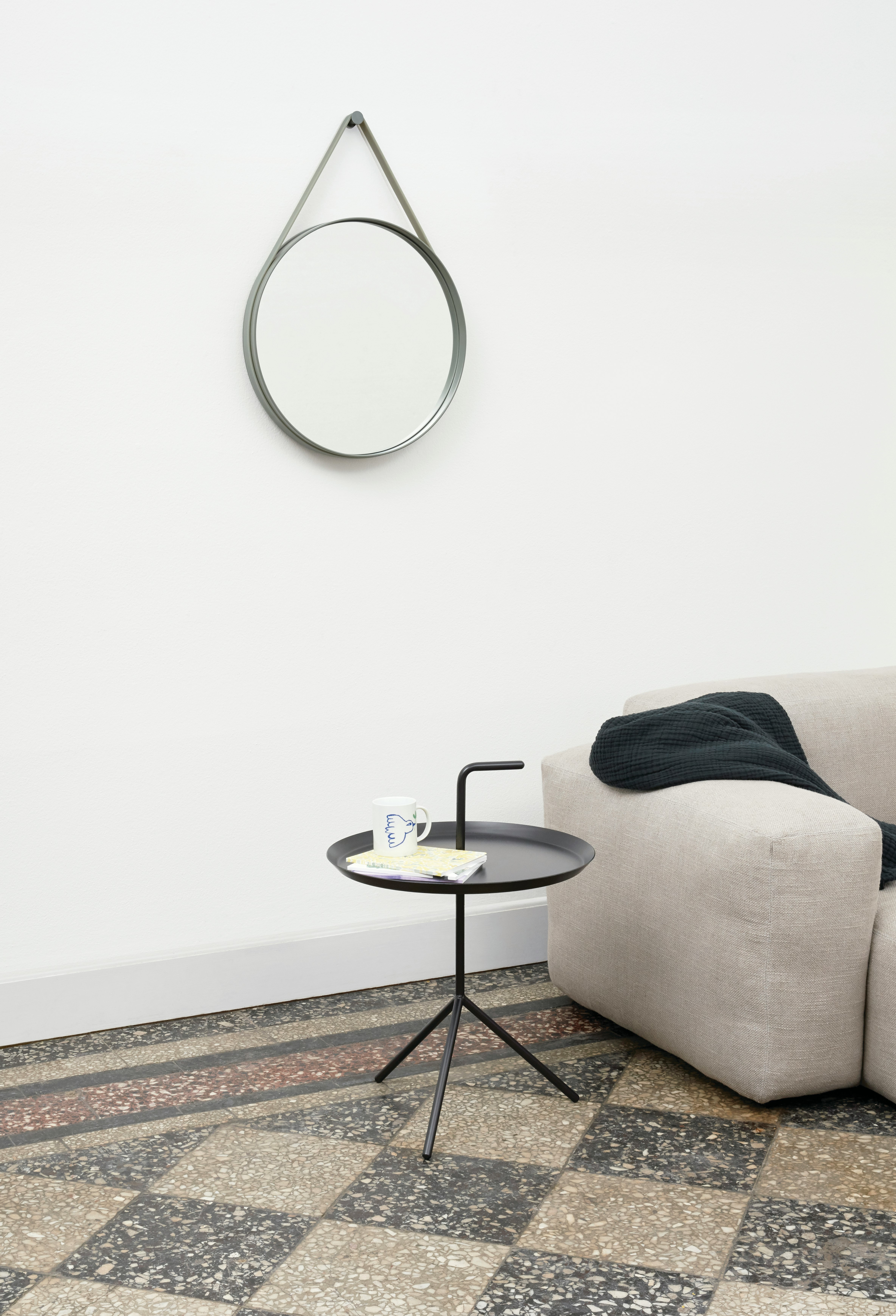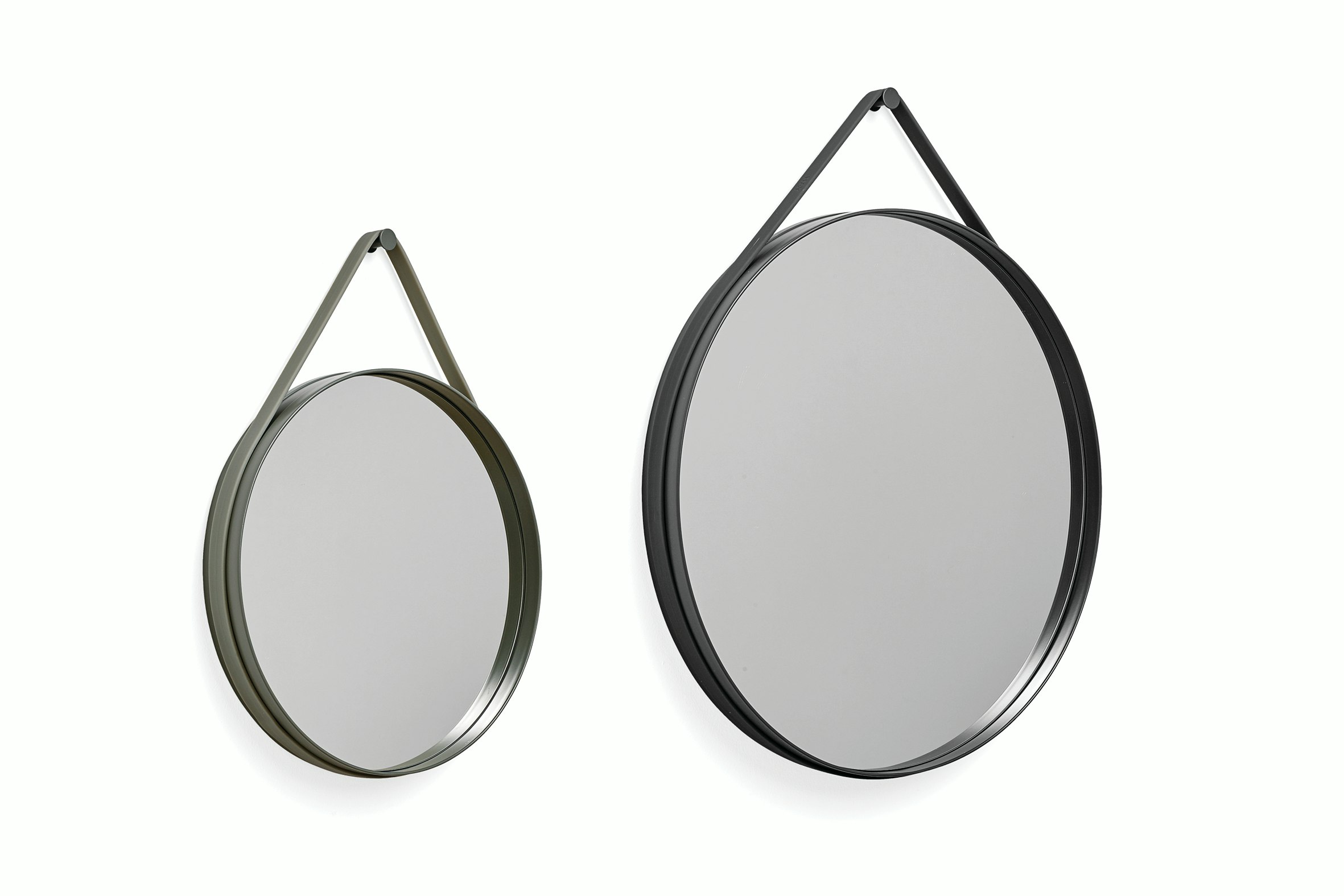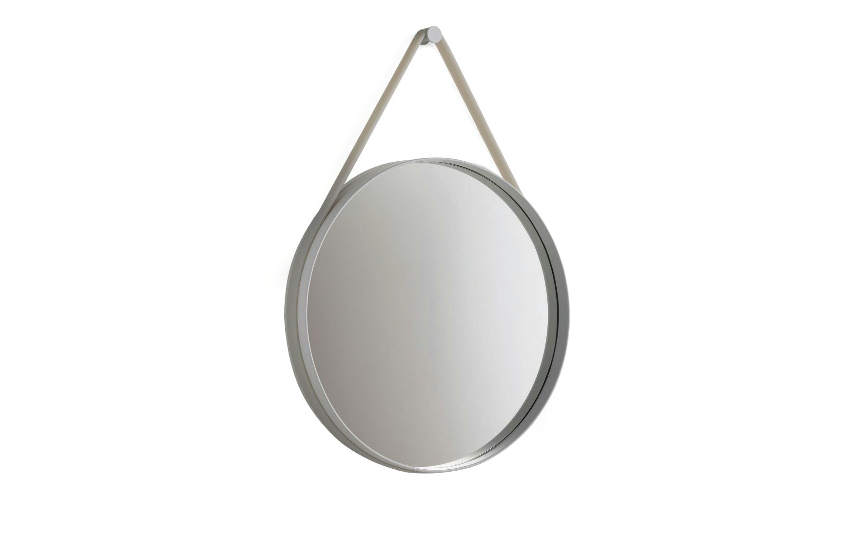 The Strap Mirror's design is stripped to a clean, circular shape. Strap features a groove around the edge to contain a sturdy rubber strap that is used to mount the mirror on the wall.